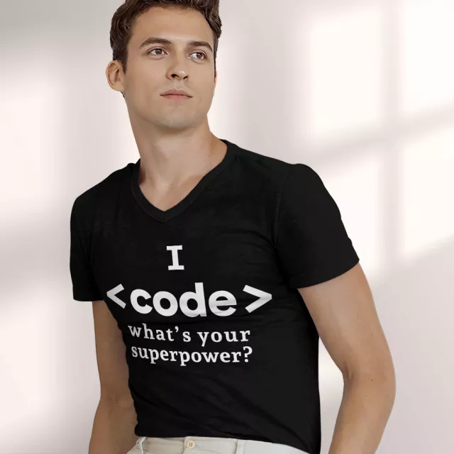 I Code What’s Your Superpower V-Neck T-Shirt is proudly made with 7x less water than average manufacturers, in recycle-friendly facilities that also guarantee zero sweatshop conditions