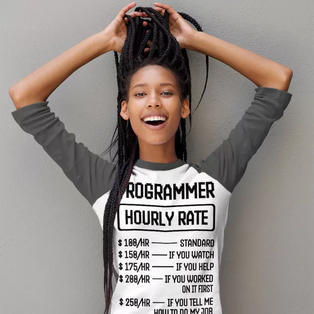 Programmer Hourly Rate Baseball T-Shirt is proudly made with 7x less water than average manufacturers, in recycle-friendly facilities that also guarantee zero sweatshop conditions. Coding Humor 3/4 Sleeve is designed and printed in California.