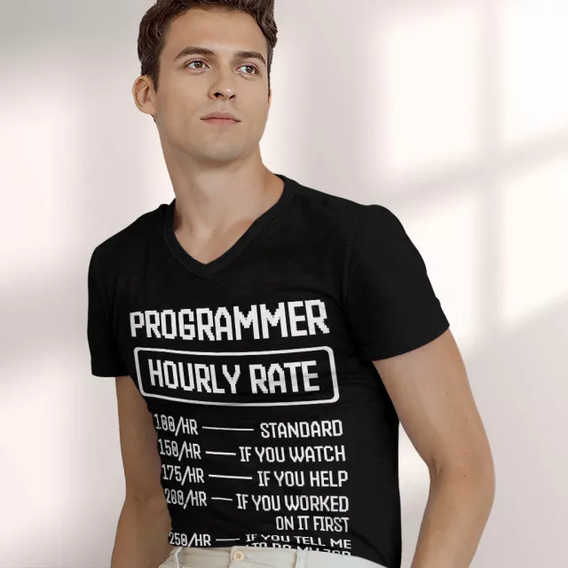 Programmer Hourly Rate V-Neck T-Shirt is proudly made with 7x less water than average manufacturers, in recycle-friendly facilities that also guarantee zero sweatshop conditions