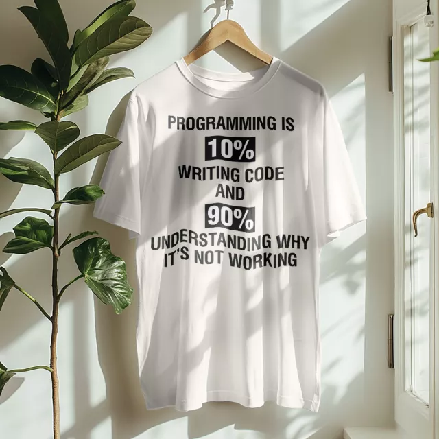 Programming Is 10% Writing Code T-Shirt is no ordinary piece of clothing. Its taped neck and shoulders, double-needle sleeve and bottom hems, and quarter-turned construction provide a retail fit for clothing that’s true to size. Funny Programmer Heavy Cotton Tee is Designed and printed in California.