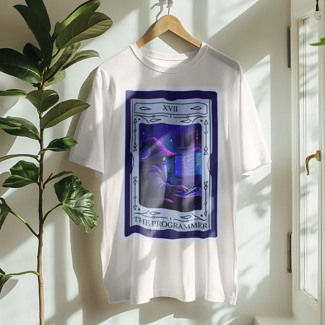The Programmer Tarot T-Shirt is no ordinary piece of clothing. Its taped neck and shoulders, double-needle sleeve and bottom hems, and quarter-turned construction provide a retail fit for clothing that’s true to size. Coder Tarot Heavy Cotton Tee is Designed and printed in California.