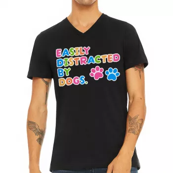 Easily Distracted by Dogs V-Neck T-Shirt – Dog Lover Humor Basic T-Shirt – Dog Parent Tee