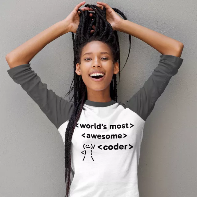 World’s Most Awesome Coder Baseball T-Shirt is proudly made with 7x less water than average manufacturers, in recycle-friendly facilities that also guarantee zero sweatshop conditions. Programming Retro 3/4 Sleeve is designed and printed in California.